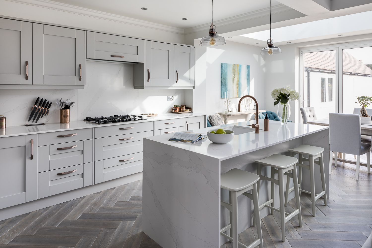 We design modern, functional kitchens in a blending style with high-quality materials.