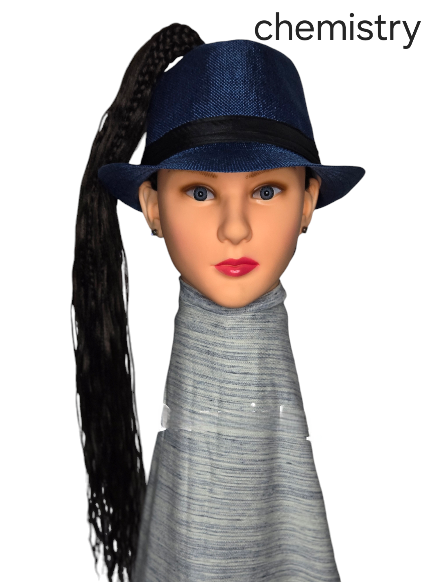 Blue hat side ponytail black synthetic knotless boxes braids