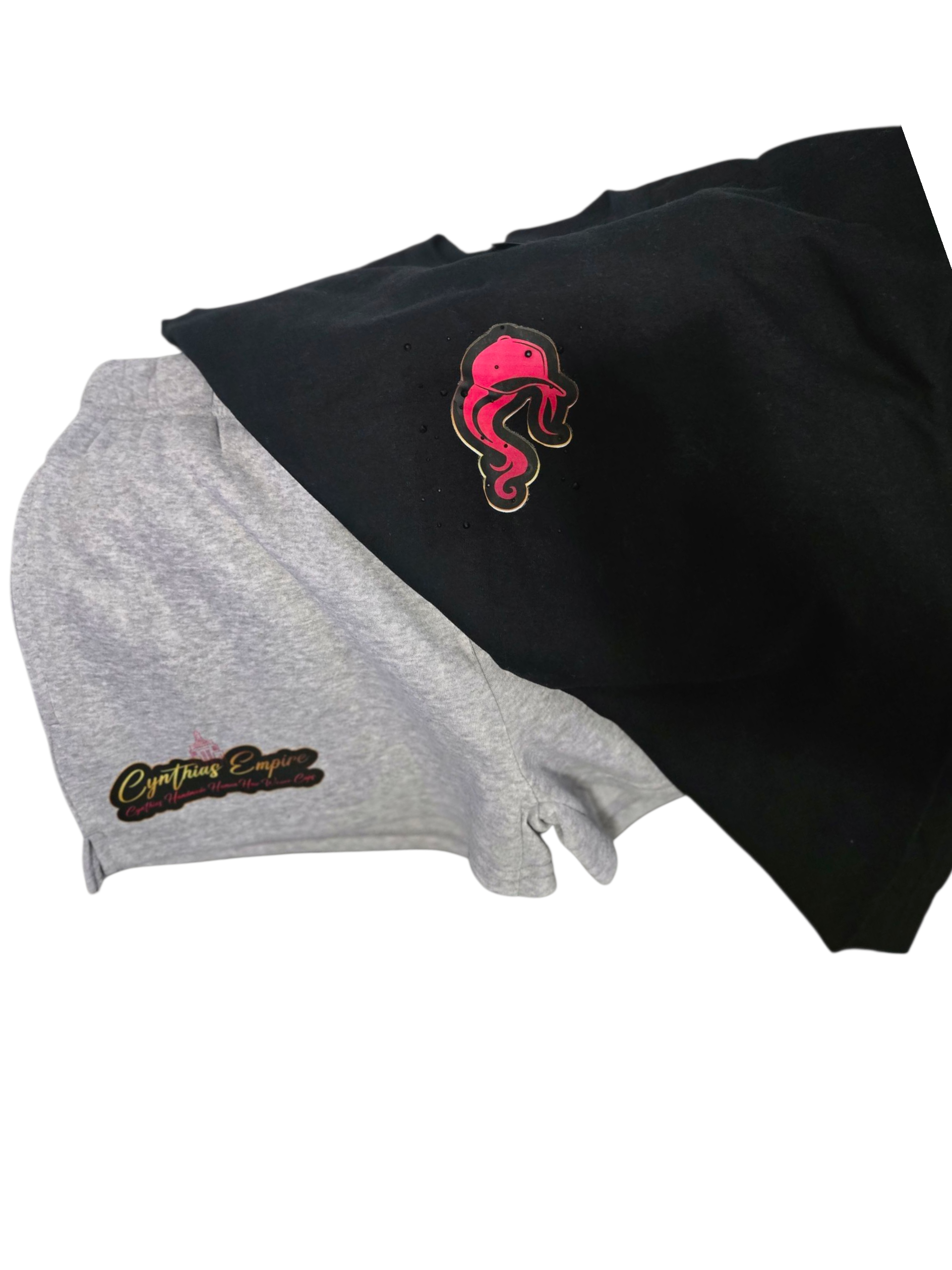 Adult Female Double printed logo shortset black tee with stones and grey shorts